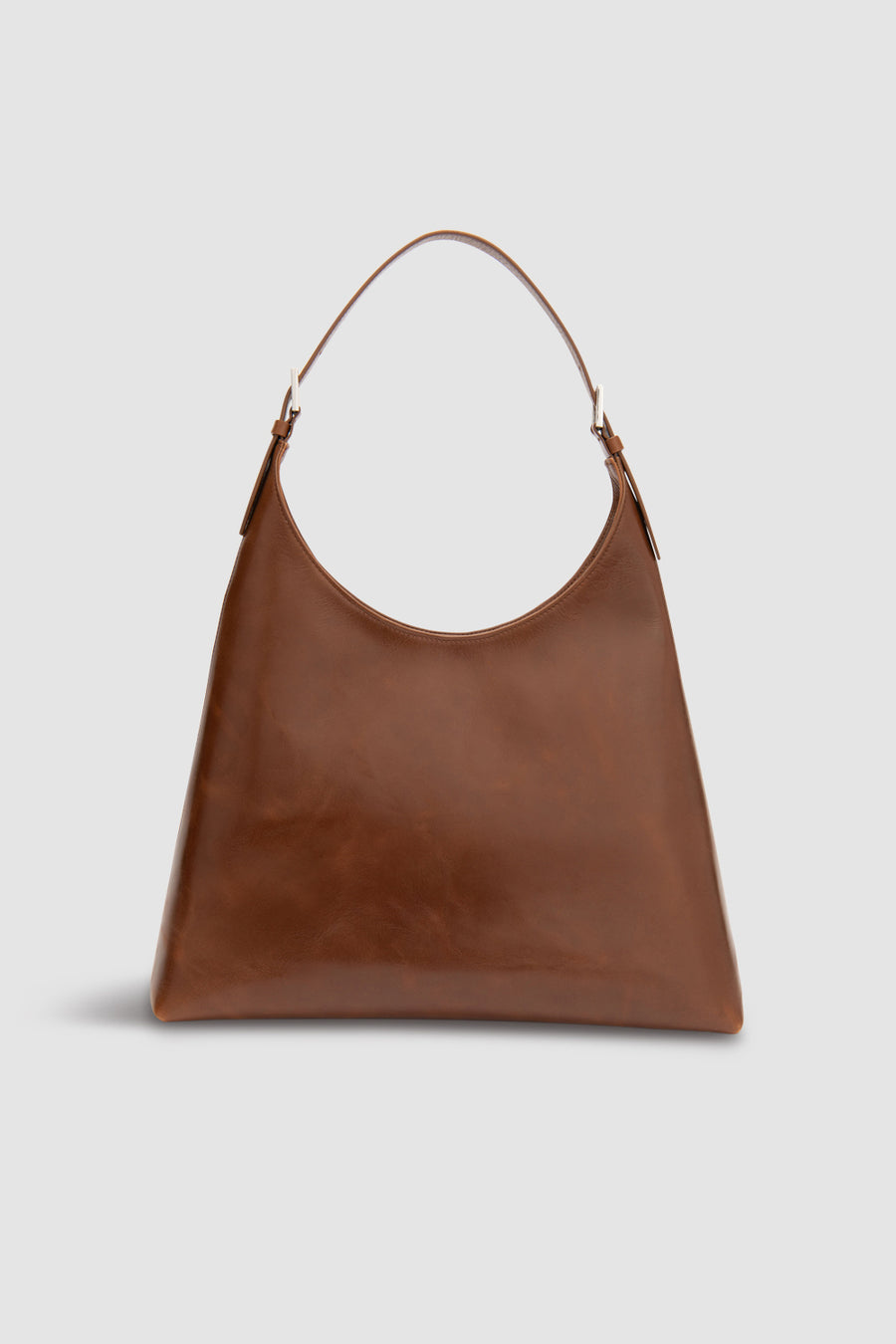 Large structured leather shoulder bag with adjustable shoulder strap and magnetic closure. Features one large compartment with micro suede lining and interior branded leather patch pocket. Fits a 13-inch laptop.