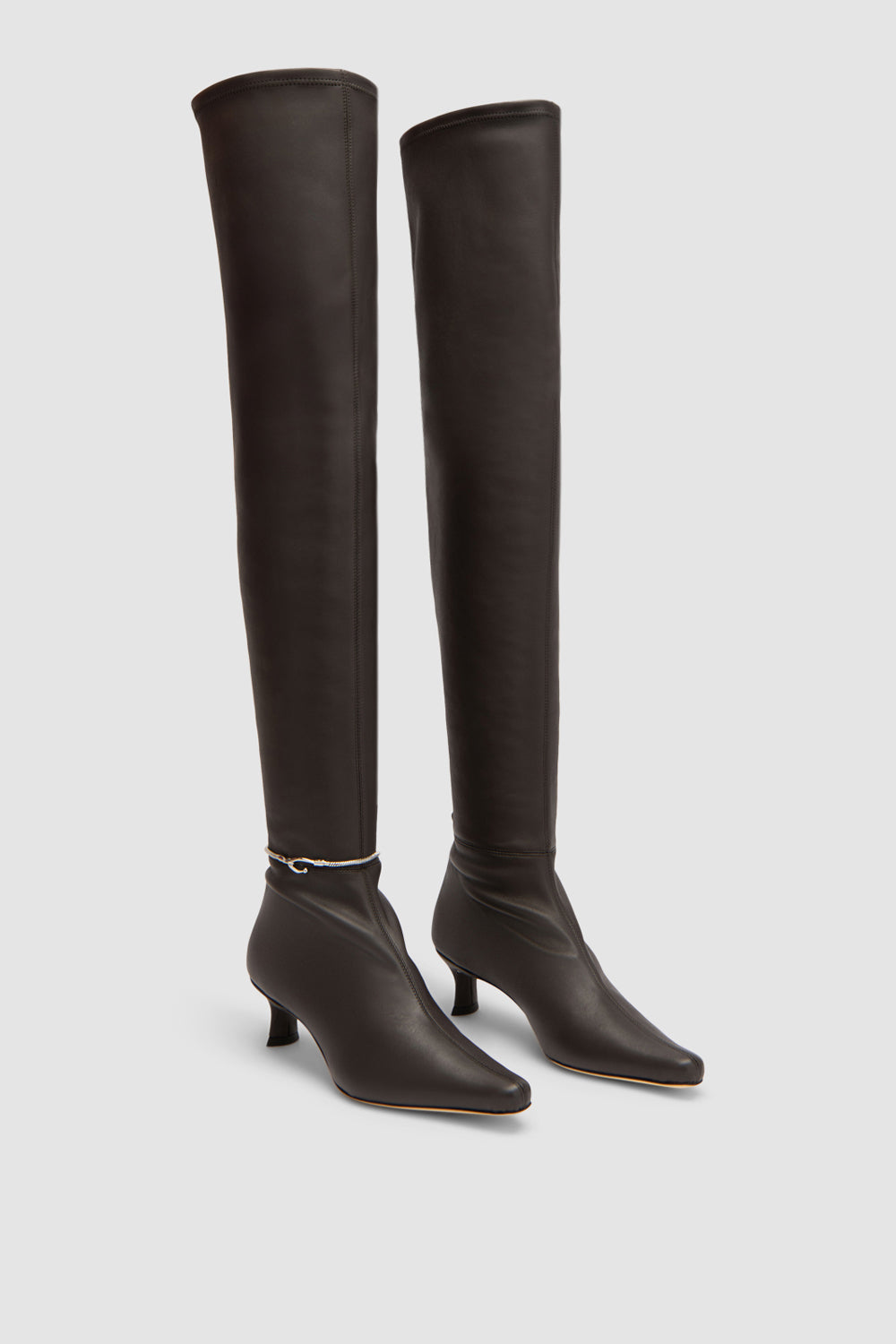 Over-the-knee stretch boot in nappa leather with a pull-on construction and central seam. Features a 5cm leather-covered kitten heel, almond toe, and a distinctive metal chain and hook detail around the right ankle. Finished with a leather sole.