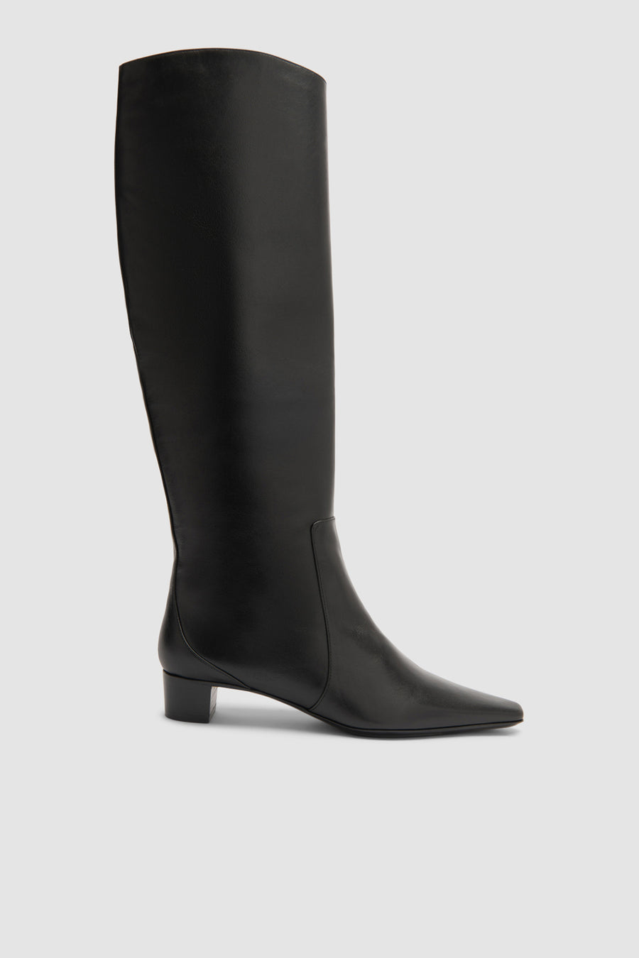 Nappa leather knee-high boot featuring a stacked 3.5cm block heel and a pointed square toe. Free of closures for pull-on ease.