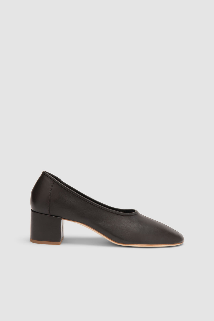Soft lamb nappa leather ballet-style pump with a glove-like, unlined construction and high topline with soft upper. Features a 4.5cm leather-covered block heel, delicate piping, central seam, and a round toeline. Finished with a leather sole.