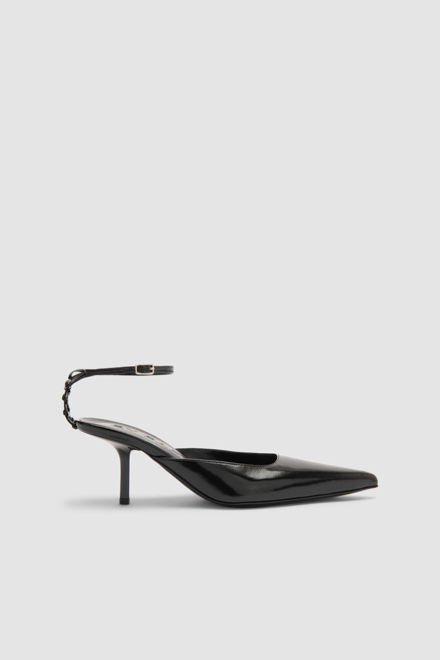 Glossy textured leather pump with an elongated pointed toeshape and square topline, featuring a tonal painted 7cm thin heel and adjustable ankle strap. Finished with a laced back detail and a leather sole.