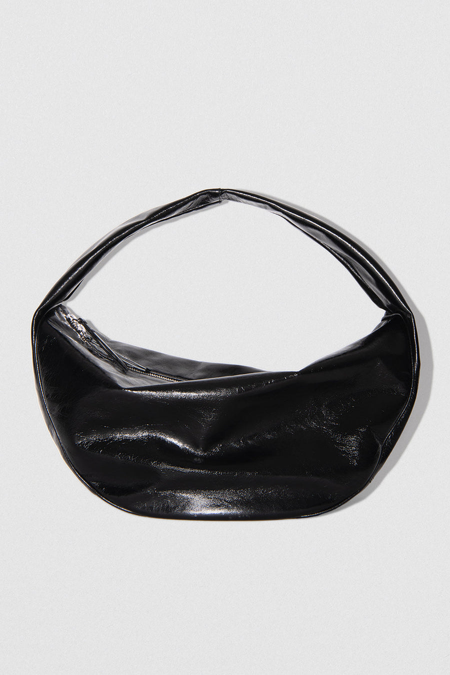 Creased leather shoulder bag with a slouchy silhouette, single strap, and zip closure. Features black cotton lining, an inside pocket, and a raised logo patch. The style is from LWG certified leather.