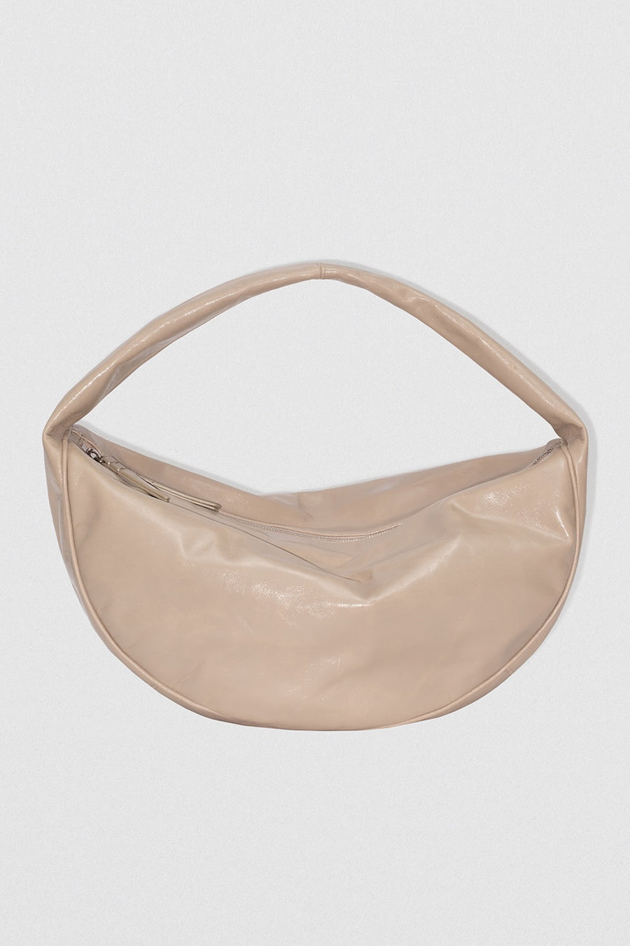 Creased calf leather shoulder bag with a slouchy silhouette, single strap, and zip closure. Features black cotton lining, an inside pocket, and a raised logo patch. The style is from LWG certified leather.