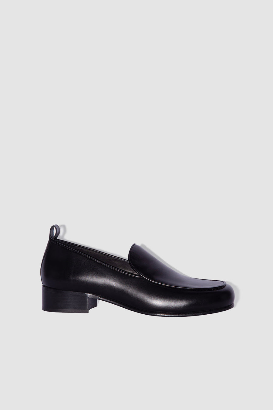 Nappa leather loafer crafted from smooth Italian cowhide, featuring a round toe, 3.5 cm stacked leather heel, and a back pull tab. Made from LWG-certified leather.