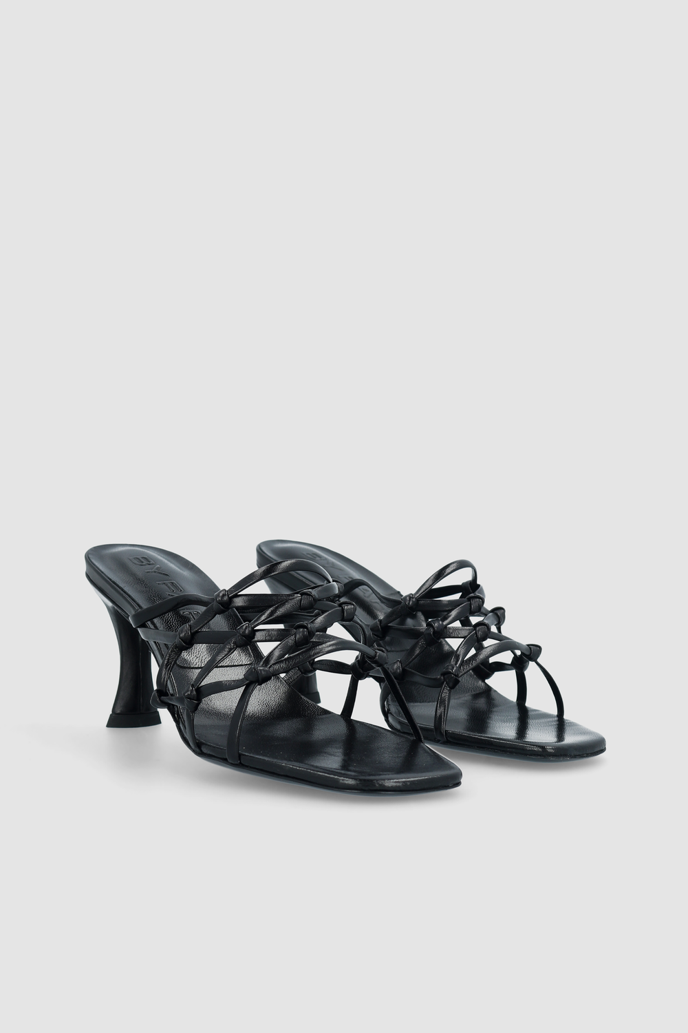 Creased calf leather mules with a 7.5 cm covered sculpted heel and hand-knotted tubular leather straps. Finished with a round toe. Made from LWG-certified leather.