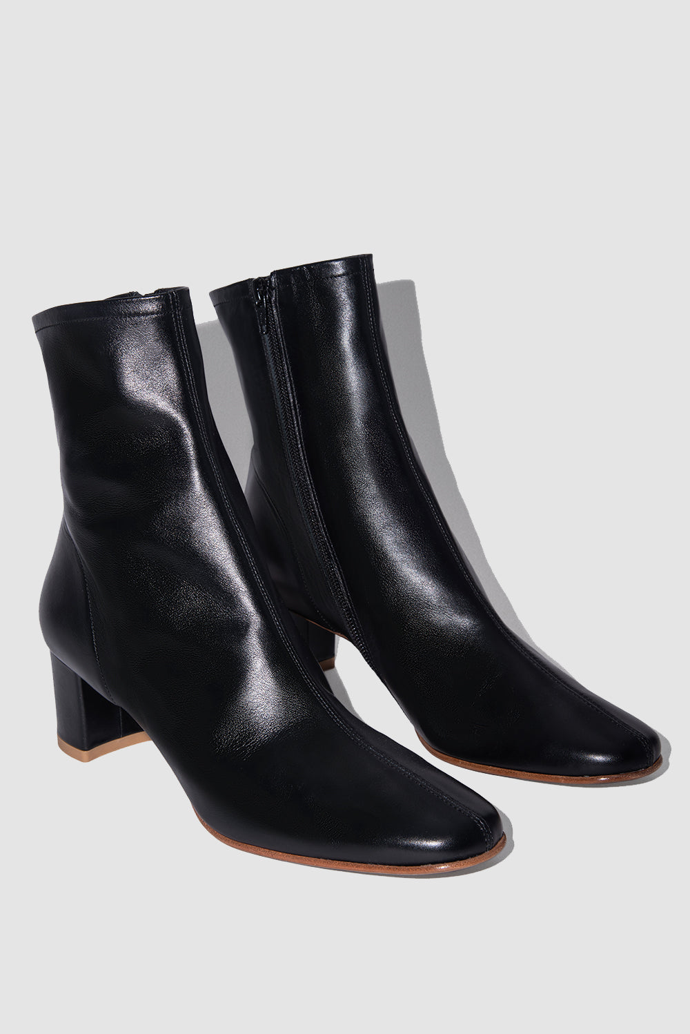 Leather ankle boots with a glove-like fit and a 5 cm leather-covered block heel. Designed with an internal side zip, elongated square toe, and delicate decorative seaming. Made from LWG-certified leather.