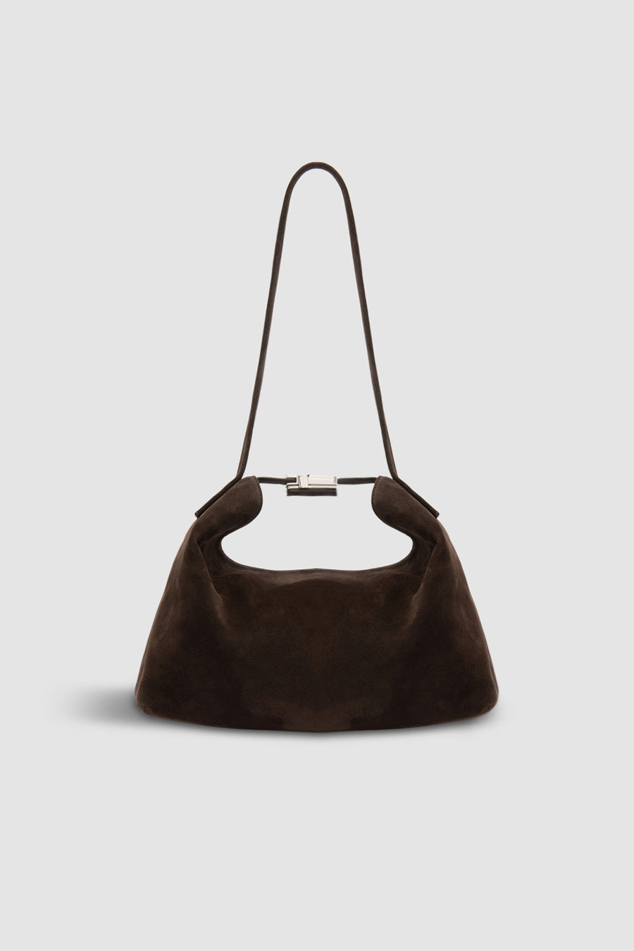 Soft and slouchy suede leather hobo bag with metal hardware offering a variety of ways to buckle/unbuckle the magnetic closure. Features inside logo patch and micro suede lining.